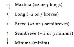 Some years ago Rob C. Wegman argued persuasively that the Missa L’Ardant desir as it survives solely in the manuscript Cappella Sistina 51 in the Biblioteca Apostolica Vaticana (Rome) represents a subsequent phase in the transmission of this mass. (The article is available here; log-in access/a subscription is required.) By transmission, I refer to the process by which a piece of music is copied and distributed in a culture before the invention of the movable type music printing press by Ottavio Petrucci at the dawn of the sixteenth century. Before this time (apart from some interesting experiments with woodcuts in the second half of the fifteenth century), all music was copied by hand, a painstaking and often expensive undertaking. Wegman pointed out that many of the unusual transformations of the rhythms and indeed melody of the L’Ardant desir tune found in the CS 51 transmission of this Mass can be explained as straightforward and some not-so-straightforward manipulations of the original melody. For example, the note values of the melody are sometimes doubled. Sometimes the melody is sung in duple meter, sometimes triple and even in quadruple meter operating a particular proportion with respect to the other voices in this four-part composition. Because certain elements of late medieval musical notation operate contextually, changing the meter of the melody also changes the value of some notes. But this is not the end of the story. As the mass progresses, the anonymous composer reaches into a grab-bag of notational tricks and subjects the melody to several unusual transformations. Sometimes the rhythms of notes are changed by simply reading the original tune’s notation as if all note stems have been erased. At one point, the melody is sung upside down, in the sense that when the original melody rises, its transformation falls, and vice versa. At the very end of the Mass, in Agnus dei III, the composer reaches further into his bag of tricks and modifies the melody’s rhythm by changing the longest note, called the maxima in medieval music theory, into the shortest note, called the minima, and vice versa. (In practice, composers and scribes actually use notes smaller than the minima, but none of these appear in the L’Ardant desir tune. Note that the minima of late medieval notation is the ‘ancestor’ of the minim or half-note in present-day traditional music notation.) Similarly the second shortest note (the semibreve) is swapped for the second longest note (the long), and vice versa, but the middle note, the breve, stays the same, as shown here.