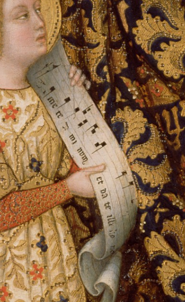 So, after recovering from the eye-boggling sheer beauty of this piece, I noticed that the choir of angels on either side of the lower half of the panel were holding rolls on which musical notation appears. The music notation is of the type found in choir books of liturgical plainchant from the late thirteenth-century onwards, developed by Dominican and Franciscan reformers whose religious orders brought about fundamental transformations in the natural and notation of plainchant after their founding the early thirteenth century.
