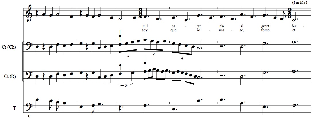 In one sense, online editing platforms offer solutions for dealing with a more ancient ‘technology’ for reproducing musical notation. Medieval music was written by hand (hence is always found in manuscripts): music printing presses didn’t exist until the second half of the fifteenth century. When a medieval musical composition survives in two or more sources, an editor often encounters differences between them, sometimes errors, sometimes perfectly performable and acceptable readings. One example I discuss, Goscalch’s En nul estat (or Car nul estat), survives in two copies with slight differences in the Contratenor voice. Both readings are perfectly acceptable, even if complex in their genesis.